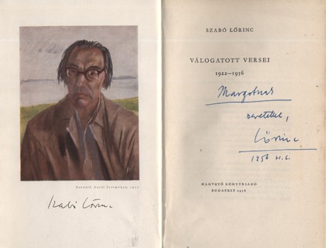 Szabó Lőrinc Szabó Lőrinc válogatott versei. 1922-1956. Simonffy Margot előadóművésznek dedikált példány.