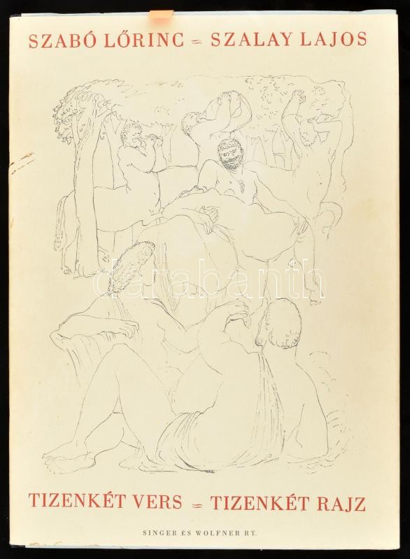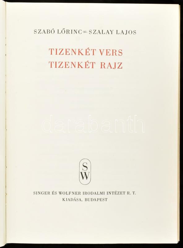 Szabó Lőrinc – Szalay Lajos: Tizenkét vers – Tizenkét rajz. Bp., 1943, Singer és Wolfner (Hungária-ny.), 64+(4) p. Kiadói illusztrált félvászon-kötés, minimálisan foltos kiadói papír védőborítóban, karton tékában. Számozott (36./1000), a szerző, Szabó Lőr