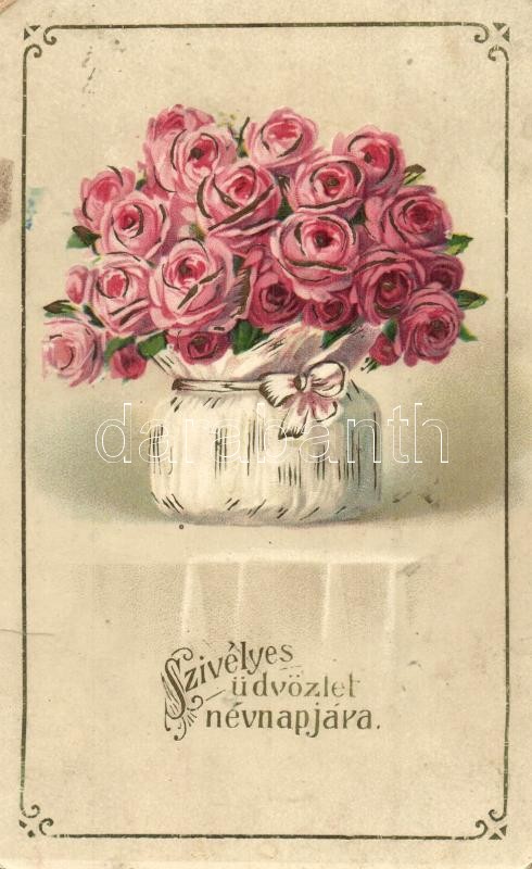 ‘Szívélyes üdvözlet névnapjára’ / Nameday greeting postcard, roses, litho (kopott sarkak / worn corners)<a href="https://www.darabanth.com/hu/gyorsarveres/421/kategoriak~Kepeslapok/Udvozlolapok-Unnepek~1500051/Szivelyes-udvozlet-nevnapjara-Nameday-g