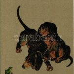 Tacskók. Dombornyomott litho / Dachshund dogs. Embossed litho