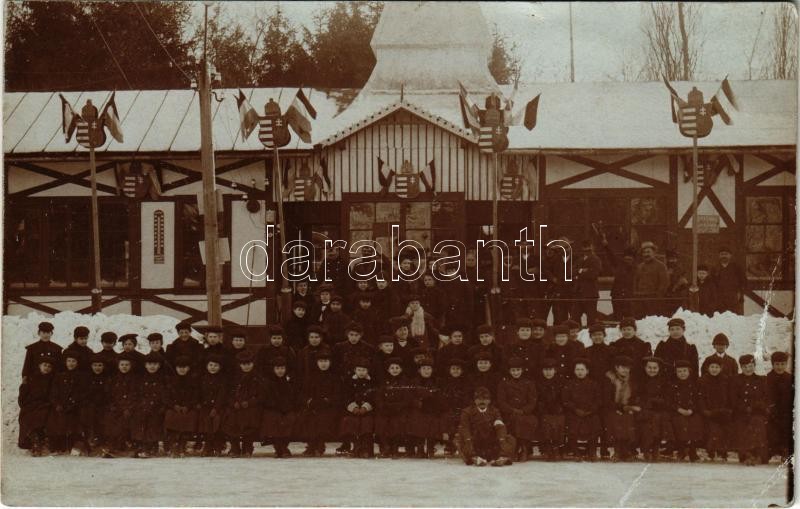 Temesvár, Timisoara; Jégpálya magyar címerekkel és zászlókkal, korcsolyázók csoportképe télen / ice rink, ice skaters’ group photo, winter, Hungarian coat of arms and flags (EK)<a href="https://www.darabanth.com/hu/gyorsarveres/422/kategoriak~Kepesl