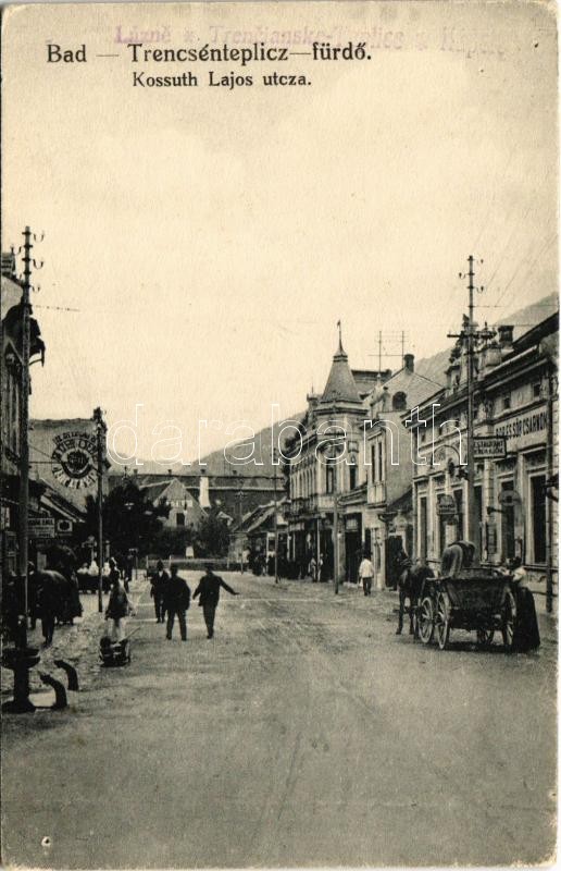 Trencsénteplic-fürdő, Trencianske Teplice; Kossuth Lajos utca, lovaskocsi, bor és sör csarnok, vendéglő, étterem, üzletek, Attila ház / Restaurant Wiener Kuche / street, restaurant, beer and wine hall, shops<a href="https://www.darabanth.com/hu/nagy