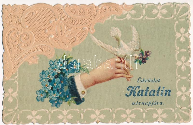 Üdvözlet Katalin névnapjára. Csipke hatású dombornyomott virágos litho üdvözlőlap / Name day. Lace style ermbossed litho greeting art postcard<a href="https://www.darabanth.com/hu/gyorsarveres/412/kategoriak~Kepeslapok/Udvozlolapok-Unnepek~2000087/U