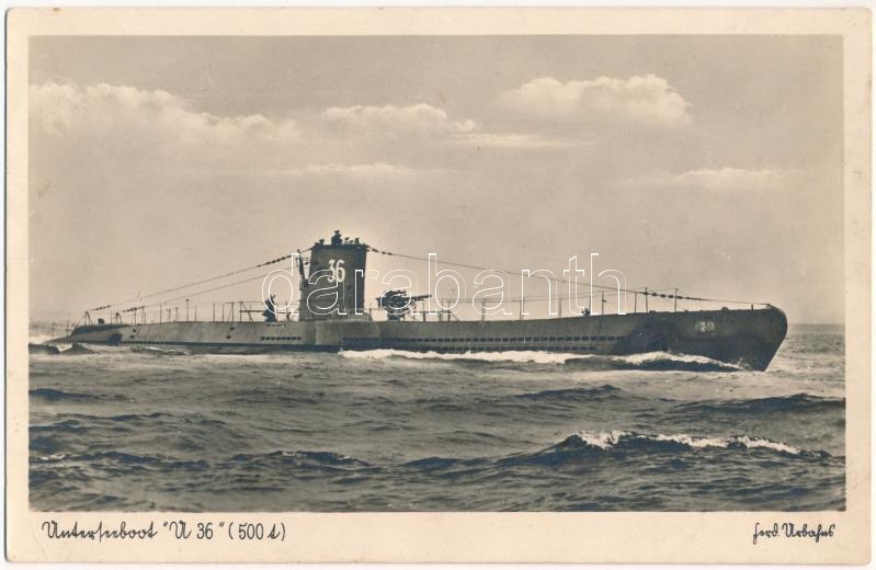 Unterseeboot U 36. Reihe Kriegsmarine Nr. 1243. / German submarine U-36 / Német U36 tengeralattjáró (EK)<a href="https://www.darabanth.com/hu/nagyaukcio/38/kategoriak~Kepeslapok/Hadihajo~15702/Unterseeboot-U-36-Reihe-Kriegsmarine-Nr-1243-German-subm