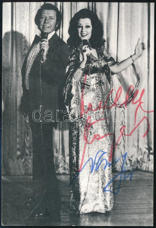 Vámosi János (1925-1997) – Záray Márta (1926-2001) énekespár aláírása őket ábrázoló nyomtatványon 15×10 cm