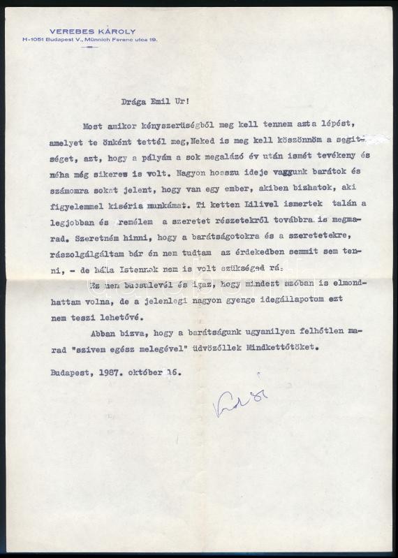 Verebes Károly (1920-1987): színművész autográf aláírással ellátott levele Sívó Emil szerzőnek nem sokkal halála előttről<a href="https://www.darabanth.com/hu/gyorsarveres/424/kategoriak~Mutargy-papirregiseg-egyeb/Tortenelmi-dokumentumok-keziratok-e