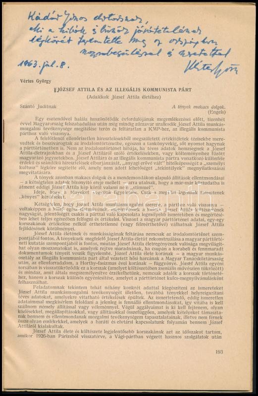 Vértes György: József Attila és az illegális kommunista párt. (Adalékok József Attila életéhez.) Különlenyomat az Irodalomtörténeti Közlemények 1963/2. számából. Bp., Akadémiai-ny., 193-218 p. Kiadói papírkötés. A szerző, Vértes György (1902-1976) író, sz
