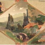 Visegrád, Etzelsburg, Hauptthor, Brunnen / Vár a főkapuval és kúttal. H. Koch Wien I. No. 19. Art Nouveau, litho s: J. König<a href="https://www.darabanth.com/hu/nagyaukcio/38/kategoriak~Kepeslapok/Magyarorszag~15644/Visegrad-Etzelsburg-Hauptthor-Br