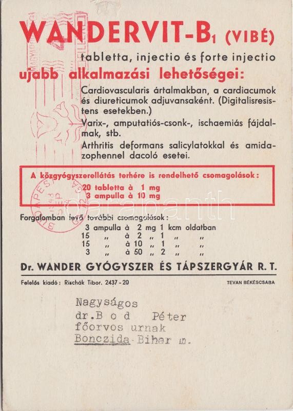 Wandervit B. a szénhydrátok feldolgozását a szervezetben támogatja, reklám / medicine advertisement (15.3 x 10.9 cm) (Rb)<a href="https://www.darabanth.com/hu/gyorsarveres/413/kategoriak~Kepeslapok/Reklam~2000086/Wandervit-B-a-szenhydratok-feldolgoz