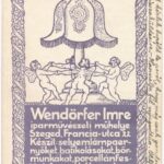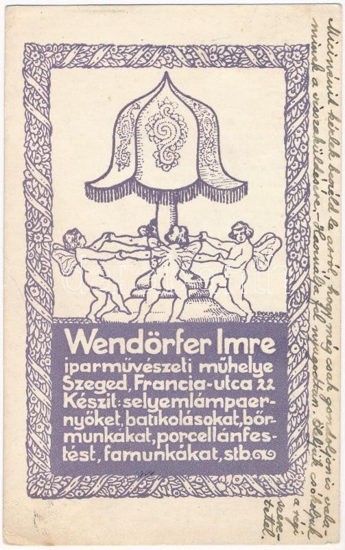 Wendörfer Imre iparművészeti műhelye. Szeged, Francia utca 22. Készít: selyemlámpaernyőket, batikolásokat, bőrmunkákat, porcelánfestést, famunkákat, stb. reklám / Hungarian applied arts workshop advertisement s: Pousar (EK)