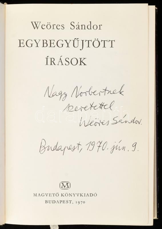 Weöres Sándor: Egybegyűjtött írások. I-II. köt. (DEDIKÁLT!) Bp., 1970, Magvető, 1 t. + 723+(1) p.; 831+(1) p. Kiadói egészvászon-kötés, kiadói papír védőborítóban. Az I. kötet címlapján a szerző, Weöres Sándor (1913-1989) Kossuth- és Baumgarten-díjas költ