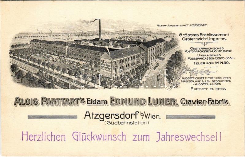 Wien, Vienna Bécs XXIII. Atzgersdorf, Alois Parttart’s Eidam Edmung Luner, Clavier Fabrik / piano factory (non PC)<a href="https://www.darabanth.com/hu/nagyaukcio/38/kategoriak~Kepeslapok/Ausztria~15659/Wien-Vienna-Becs-XXIII-Atzgersdorf-Alois-Partt
