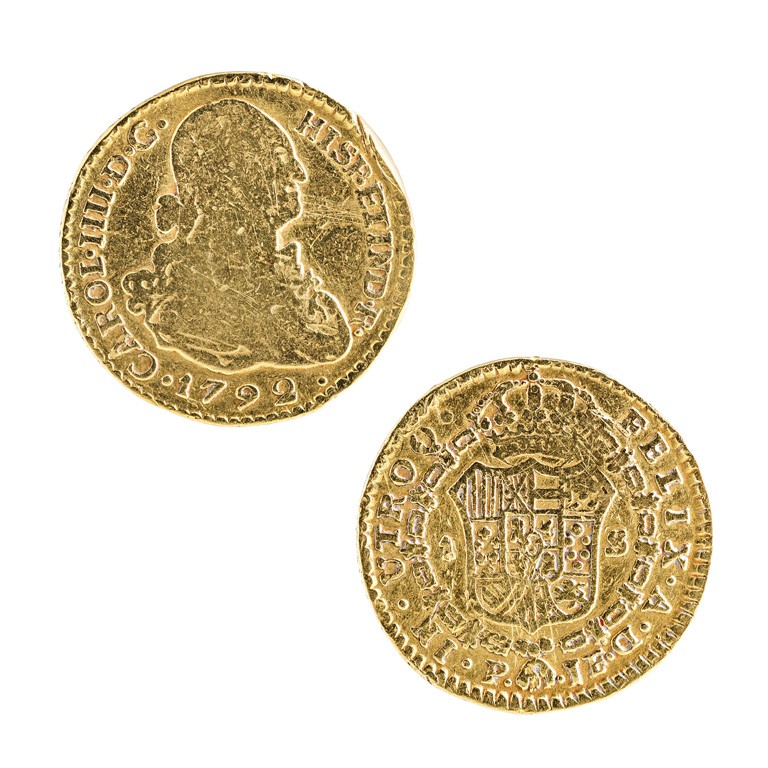 Kolumbia, 1792, 18 k arany, IV. Károly portréjával, hátoldalán koronás címerrel, FELIX A D IN UTROQ felirattal, PJF veret, kis peremhibával, megkopva, 3,3 g; d: 18 mm