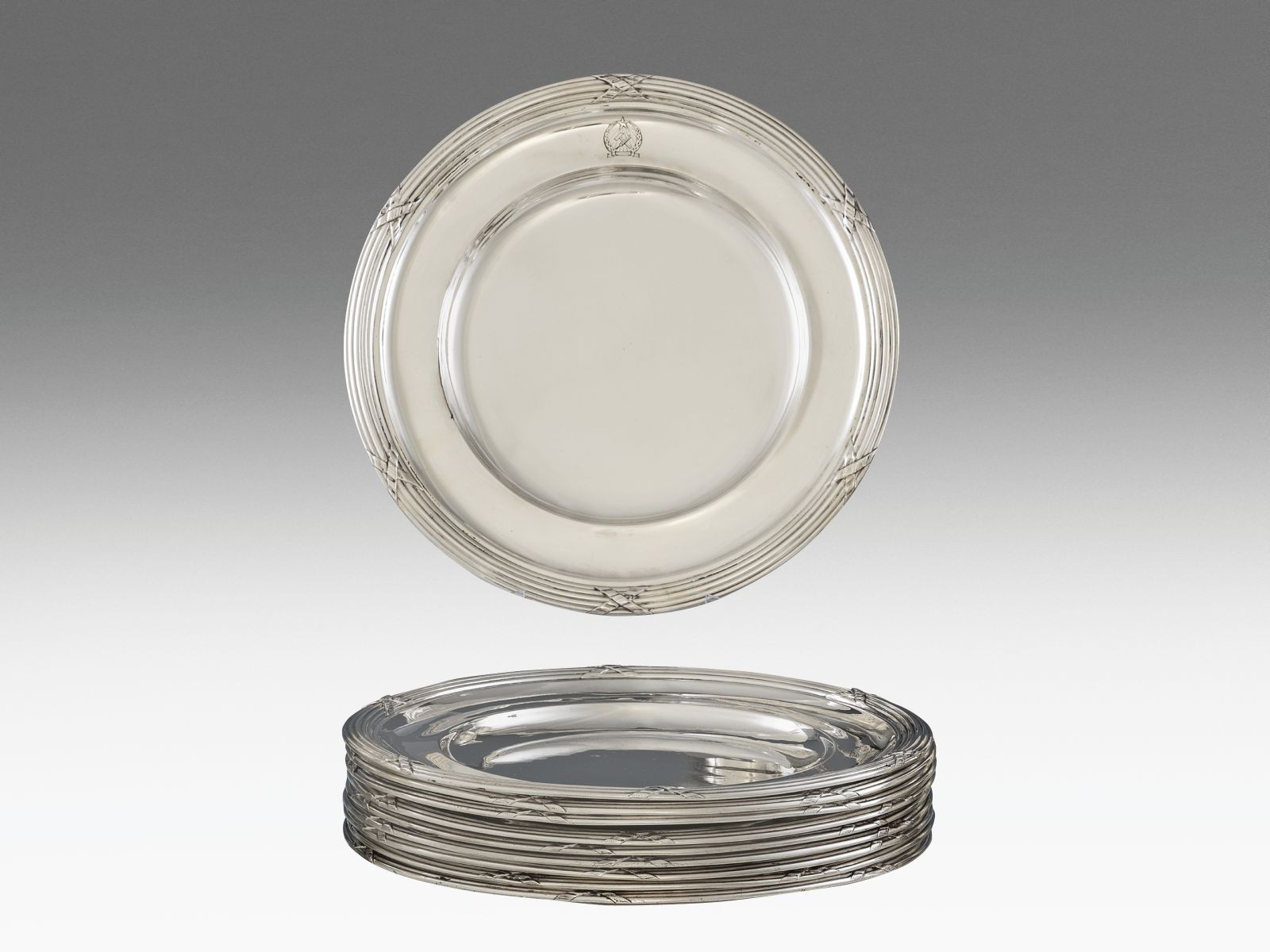 Ezüst, 5040 g. Kerek forma, barázdált peremén szalagos díszítmény, valamint minden darabon a Magyar Népköztársaság vésett címerével