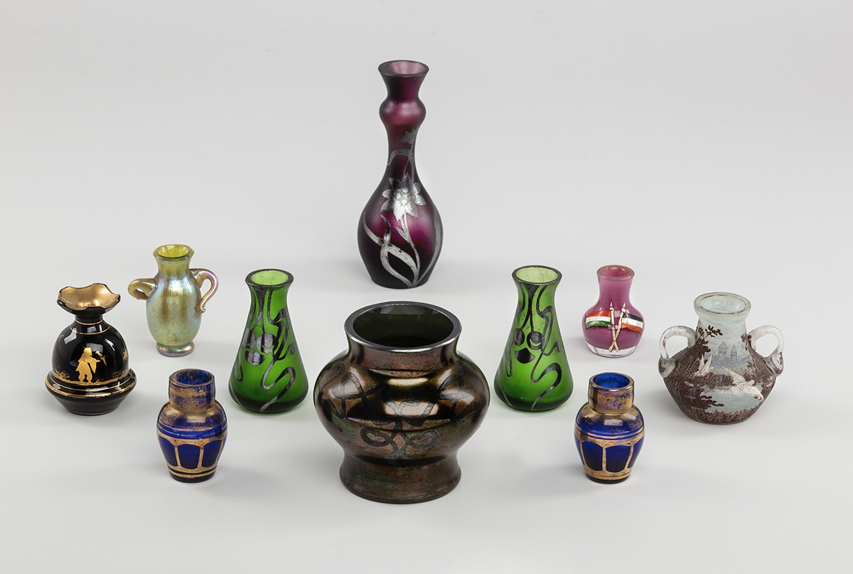 Fúvott-, aranyozott-, festett-, irizáló-, zománcozott-, és ezüstfestésű üveg vázácskák.