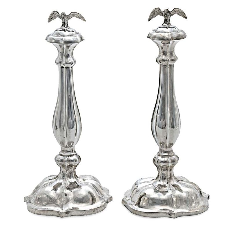 Műtárgy leírás – Bécs, 1861, 13-latos antik ezüst, Thomas Dub(?) mesterjegy, szamárhátíves, széles talpakon, balluszteres szárak, figurális sasmadár koppintókkal, javított, 685,2 g; m: 33 cm