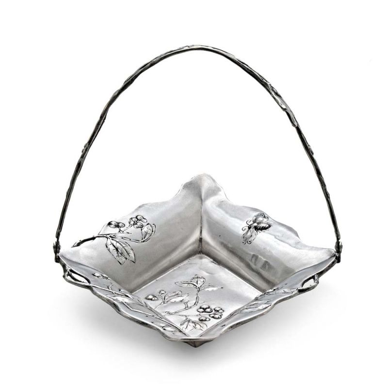 Műtárgy leírás – Bécs, 1872-1922 közötti fémjel, 800-ezrelékes ezüst, Samuel Haber(?) mesterjegy, rombusz forma, szecessziós díszítéssel, 340 g, 30,5*22*20,5 cm