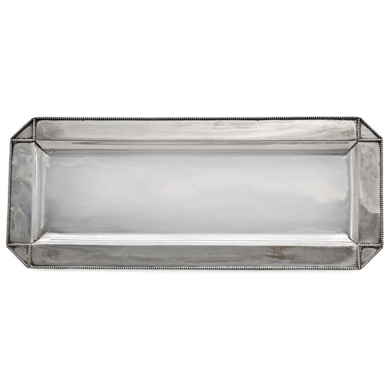 Műtárgy leírás – Bécs, 1872-1922 közötti fémjel, 800-ezrelékes ezüst, "M(?)" mesterjegy, hengerelt, csapott sarkú téglalap forma, gyöngysor díszítéssel, 511 g; 41*16,7 cm