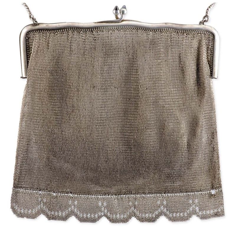 Műtárgy leírás – Pest, 1920 körül, 1867-1936 közötti fémjel, 800-ezrelékes ezüst láncszövet, szarvasbőr béléssel, kék üveg nyitógombokkal, apró sérüléssel, Btto.: 168 g; 16*17 cm