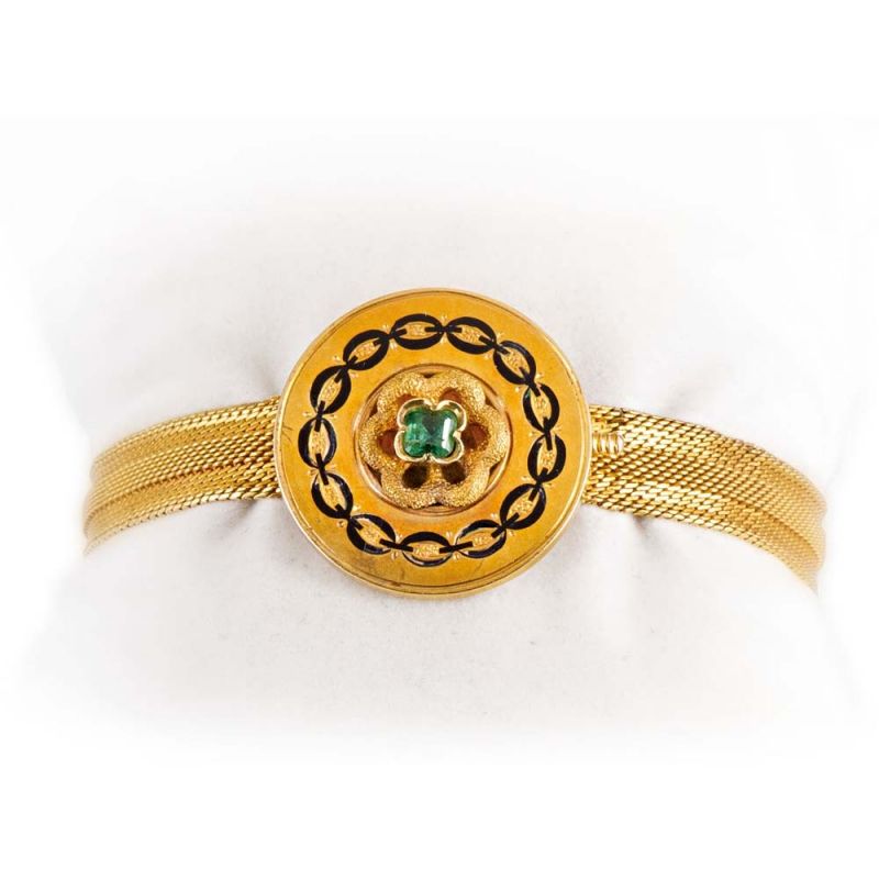 Műtárgy leírás – Pest(?), 19. sz. közepe, antik arany, kerek csatján 1 db fűzöld tábla csiszolású smaragd, kék vonalzománc díszítéssel, szövött szalaggal, nyelves záródással, doboza későbbi kiegészítés, kis, sérüléssel, 14 g; h: 17,5 cm