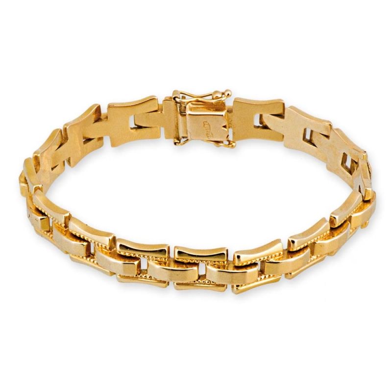 Kikiáltási ár: 950 000 FtBudapest, 1966-1999 közötti fémjel, 14 k arany, Pénzverő készítőjel, 9 db ovális csiszolású narancsvörös rodolit gránát kővel díszítve, nyelves záródással, biztonsági lánccal, 19,2 g