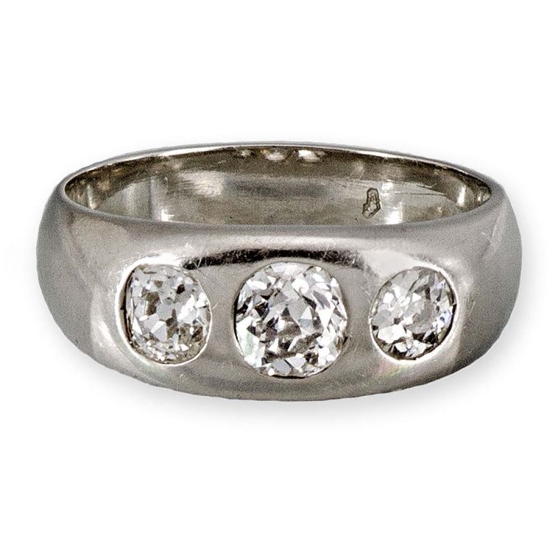 Műtárgy leírás – Bécs, 1920 körül, 14 k fehérarany, "WS" mesterjegy, öntött gyűrűtest, 3 db régi csiszolású briliánssal cca. 1,1 ct (R1-R2, W-TCr, VSI-P1) díszítve, kis sérüléssel, 6 g