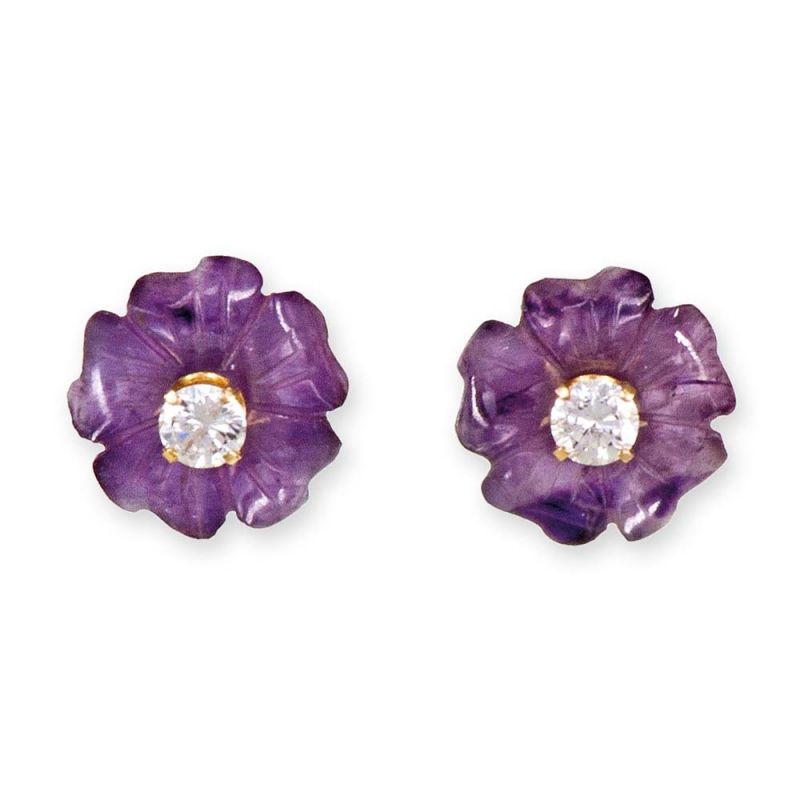 Műtárgy leírás – 20. sz. vége, 14 k arany pattintós szerelék, csiszolt ametiszt virágok közepén, karmos foglalatban 2 db modern csiszolású briliáns cca. 0,8 ct (M, W-TCr, SI1-SI2), apró sérüléssel, 3 g
