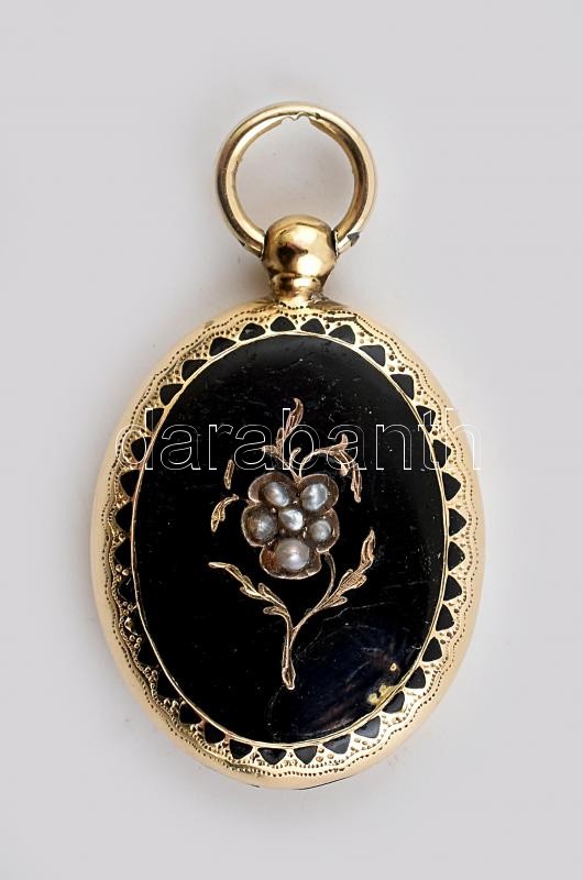 14K arany (Au) fényképtartó medál, zománc és gyöngyház berakással. Jelzett 3,4 g, 23 mm<a href="https://www.darabanth.com/hu/gyorsarveres/422/kategoriak~Nemesfem-disztargyak-ekszerek-dragakovek/Nemesfem-disztargyak-ekszerek-dragakovek~1000024/14K-ar