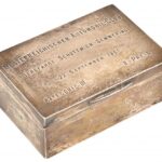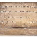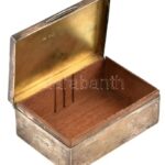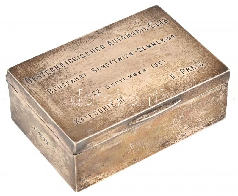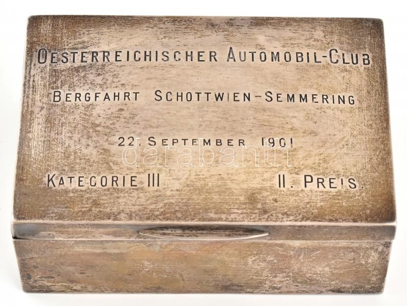 1901 Ezüst (Ag.) ‘Oesterreichischer Automobil-Club Bergfahrt Schottwien-Semmerling 22. September 1901 Kategorie III. II. Preis’ feliratú dobozka, fa betéttel és aljjal, jelzett (1901 London), a fa betét és alj kijár, nettó: 156 gr.,