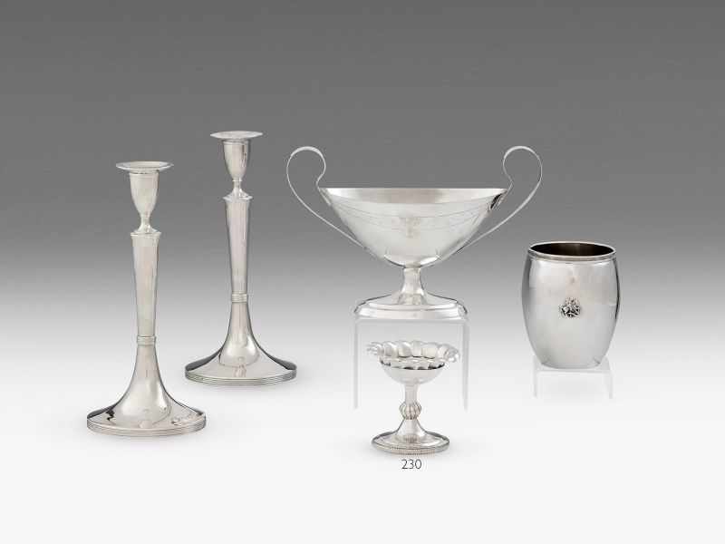 230. tétel, Kolozsvári biedermeier fűszertartó Ezüst, 82 g. Kerek, barázdált peremszélű talpon nóduszos szár, rajta karéjosan tagolt, kihajló peremszélű tálka. Alján jelzett: Kolozsvár (?), XIX. sz. közepe, ismeretlen Taubner mesterjeggyel.