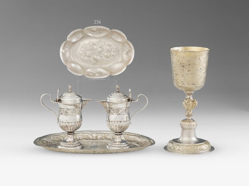 236. tétel, Borkóstoló tálka Ezüst, 175 g. Gyöngysorokkal díszített, karéjosan tagolt ovális forma. Öblében és peremén domborított és poncolt, ún. bécsirózsák. Jelzett: Felvidék (?), XIX. sz. második fele, valamint 1927 utáni csehszlovák újrabél