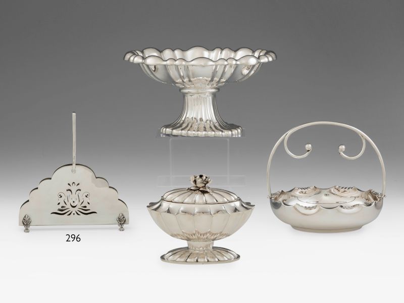 Kikiáltási ár: 40 000 FtEzüst, 153 g. Lábakon álló öblös tál, kétoldal, rokályos fülekkel. Peremén domborított és poncolt, virágos-leveles díszítményekkel. Restaurált. Feltehetően német, XIX. század közepe, MK mesterjeggyel. M.: 36 × 18,5 × 9,5 cm