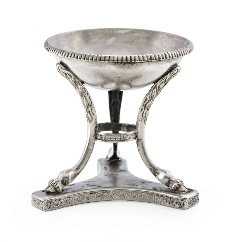 Kikiáltási ár: 2 000 FtBécs, 1828, 13 latos antik ezüst, Wallnöfer mesterjeggyel, három lábon álló edénytest, áttört sormintával, öntött alkatrészekkel, fa talapzaton, sérült, hiányos, m: 31 cm , 1628 g (bruttó)