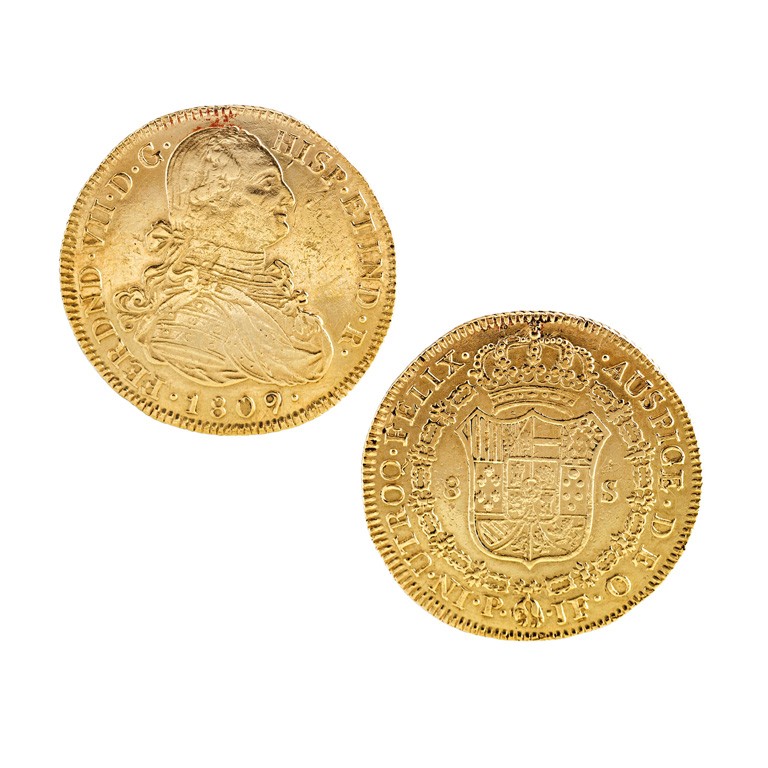 Kolumbia, 1809, 18 k arany, VII. Ferdinánd portréjával, hátoldalán koronás címerrel, AUSPICE DEO IN UTROQ FELIX felirattal, PJF veret, rovátkolt peremmel, 26,9 g; d: 37 mm
