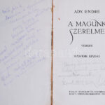 Ady Endre: A magunk szerelme. Versek. A címlapon, Sértő Kálmán (1910-1941) költő, író, újságíró ajándékozási soraival, és autográf aláírásával. Bp., 1919., Pallas, 120+3 p. 2. kiadás. Korabeli félvászon-kötés, a megajándékozott személy soraival, bejegyzéseivel és bejelöléseivel.