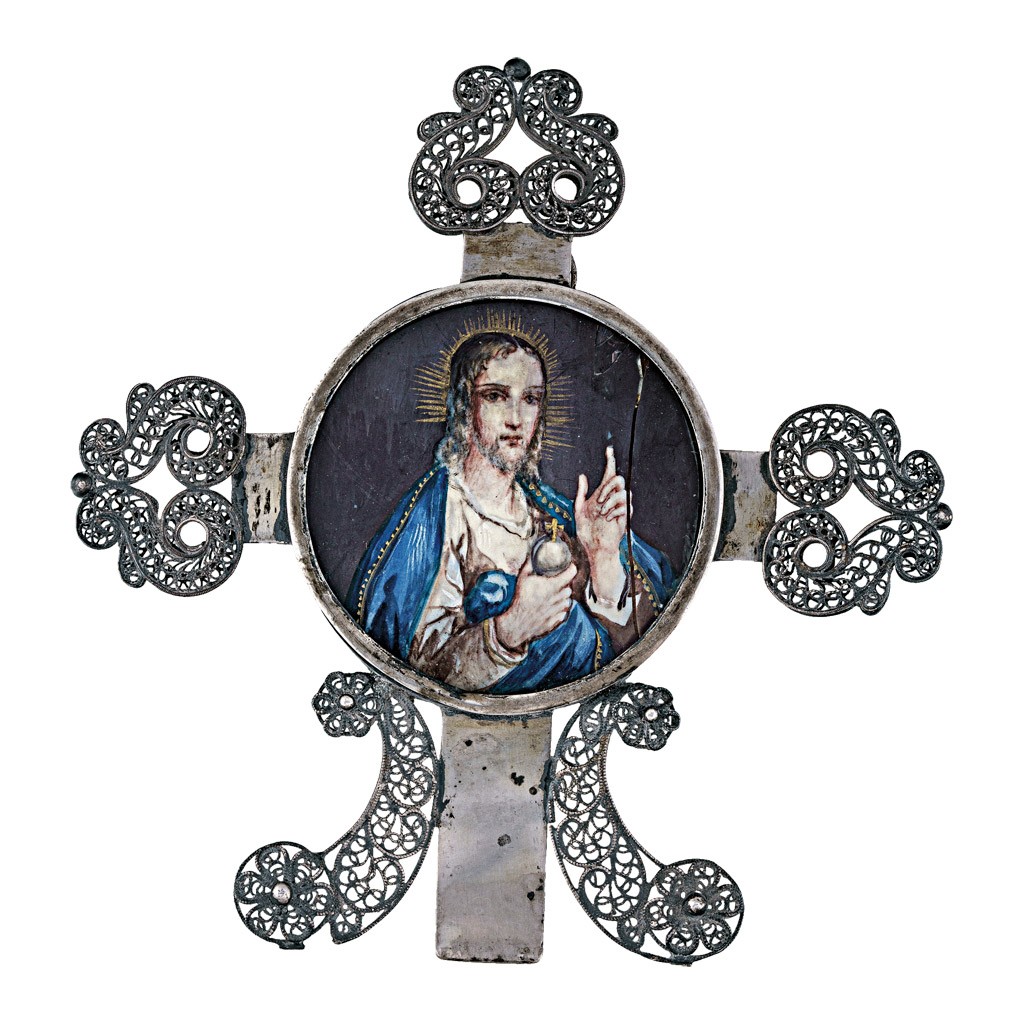 Bécs, 1847, 13 latos antik ezüst, Johan Mayer mesterjegy, filigrán díszes keresztbe csontra festett kegykép, egyházi tárgy felső dísze lehetett, sérült
