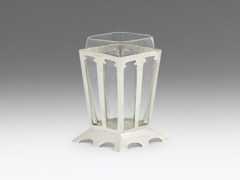 Ezüst, 219 g. Áttört, szögletes, ezüst foglalatban fúvott, színtelen, pótolt üvegváza.