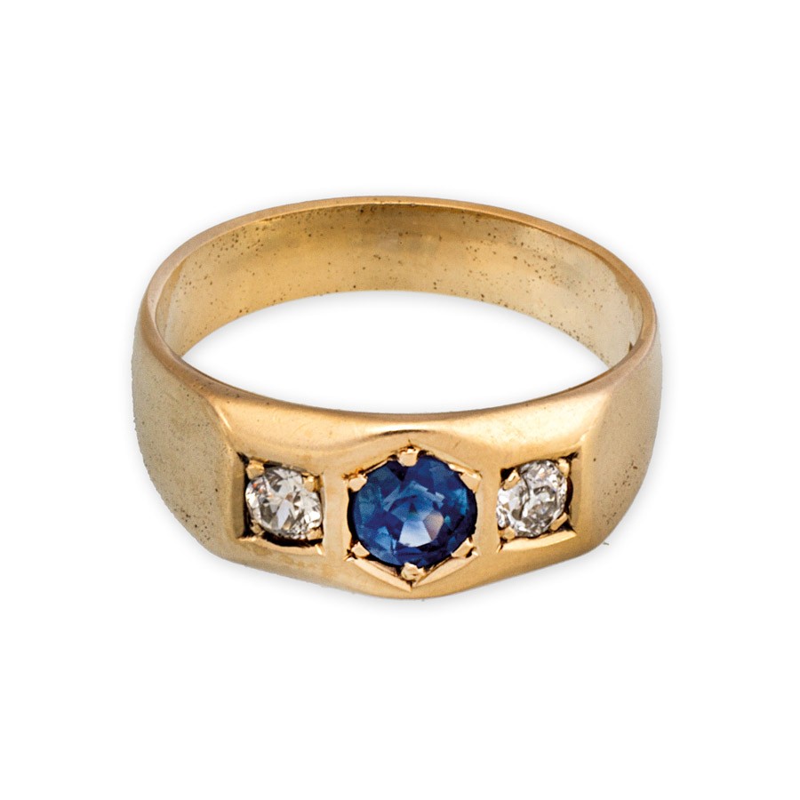 Pest, 1867-1936 közötti fémjel, 14 k arany, "RM" mesterjegy, karmos foglalatban 1 db kék zafír és 2 db régi csiszolású briliáns cca. 0, 3 ct (R1, TCa-Ca, SI-P2), 5, 4 g