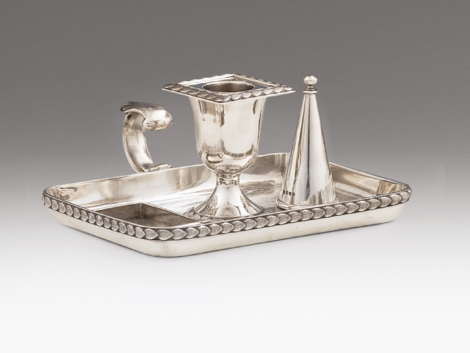 Ezüst, 394 g. Téglalap formájú tálkán gyertyatartó és gyertyaoltó kupak, ívelt, akantuszleveles fogóval. Peremeken frízben vésett leveles díszítmény.