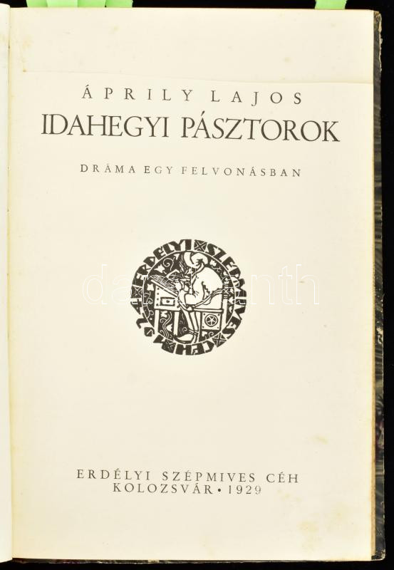 Áprily Lajos: Idahegyi pásztorok. Dráma egy felvonásban. Az Erdélyi Szépmíves Céh 37. kiadványa. Kolozsvár, 1929., Erdélyi Szépmíves Céh, 81+3+VII p. Az oldalszámozáson belül gróf Bánffy Miklós színes, egész-oldalas, illusztrációval. Kiadói félbőr-kötésben, Rohonyi Antal-kötés, kissé kopott borítóval, a címlap felső részén egy csíkban hiánnyal. Számozatlan példány.
