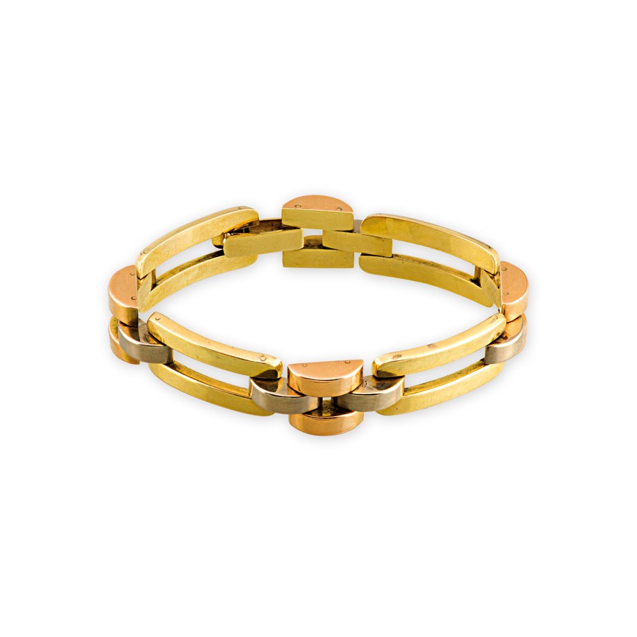 Budapest, 1937-1966 közötti fémjel, 14 k fehér- sárga és vörösarany kombináció, glídes fazon üreges szemekkel, elmosódott mesterjegy, kacsos zárral, 18, 6 g; h: 19, 3 cm