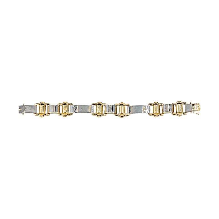 20. sz. eleje, 1902-1936 közötti behozatali jellel, Pesti Hivataljellel, 14 k sárga- és fehérarany, üreges fazon, nyelves záródással, dupla biztosító nyolcassal, sérült, 14,8 g; h: 18,5 cm