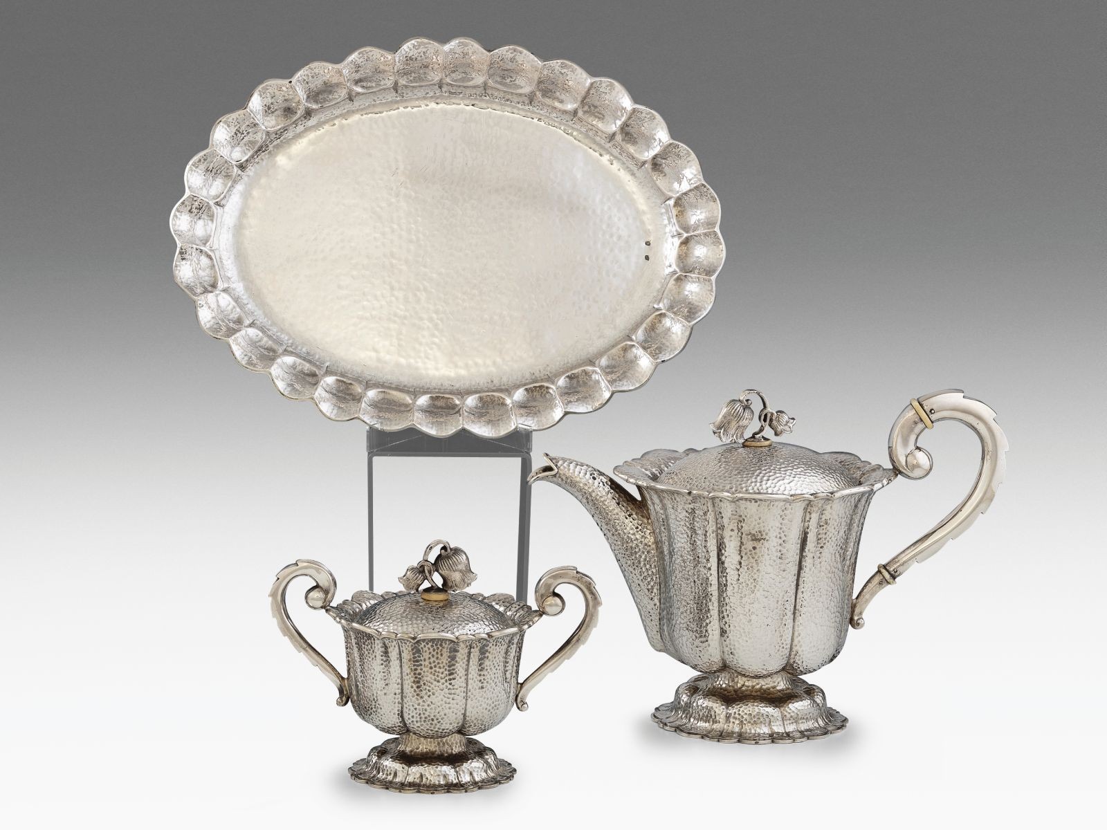 Trébelt ezüst, 1963 g., matlézott díszítménnyel. Teáskanna és cukortartó, korabeli szervíz tálcával. Kanna zsanéros-, ill._x000D_