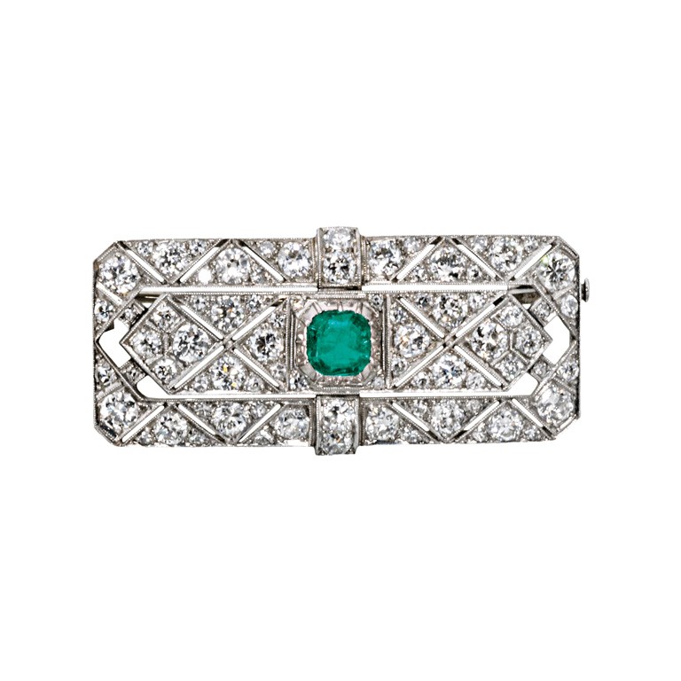 1920 körül, 1937-1966 közötti budapesti fémjellel ellátva, platina és 14 k fehérarany tű, "GL" mesterjegy, áttört szögletes forma, félmodern és régi csiszolású briliánsokkal és gyémántokkal, (M2-R1, W-TCr, VVSI-SI1) díszítve, közepén 1 db mély zöld smarag