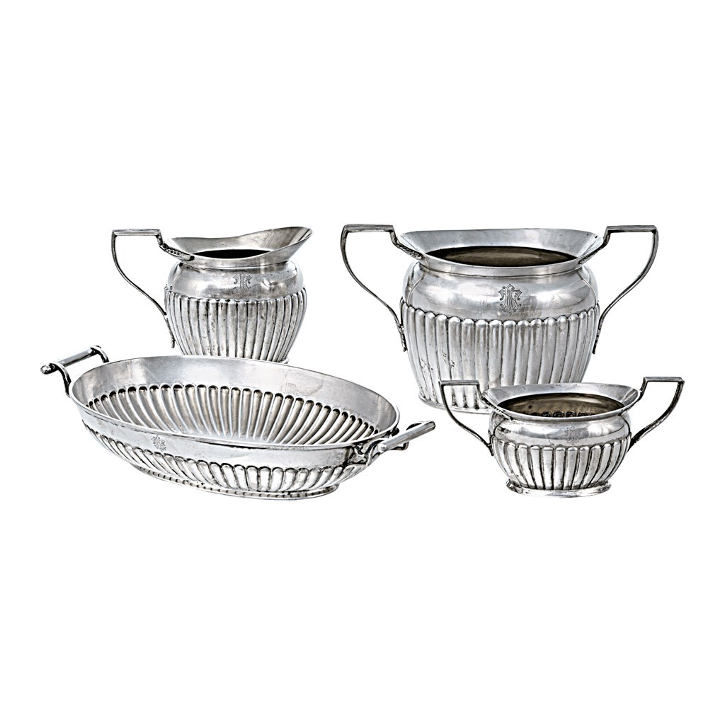 Pest, 1867-1936 közötti fémjel, 800 ezrelékes ezüst, tálon Bachruch mesterjegy, az edényeken AB jelzet, vésett TL tulajdonosi monogrammal és bordázott díszítéssel, össz.: 4 db, apró hibával