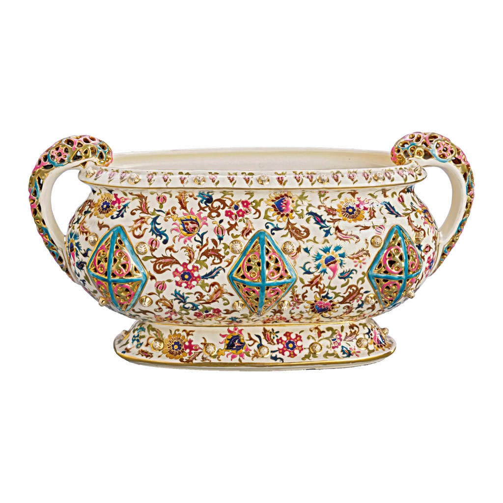 Fischer Ignác, Budapest, 1880 körül, festett, aranyozott, áttört fehércserép, perzsa dekorral, talpán jelzett: kék Fischer I. Budapest és masszába nyomott 1083 formaszám, fülnél kis, tűzi repedés