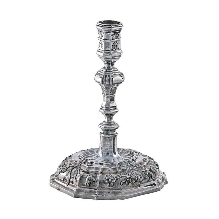 Augsburg, 1723-1735 közötti fémjel, antik ezüst, "ML" (?) mesterjegy, kalapált, domborított, hullámzó magas talpazat poncolt virágszálakkal és későbbi "B5230" jelzettel, nyolcszögletes tagolt, szár javított, 166 g; m: 15 cm