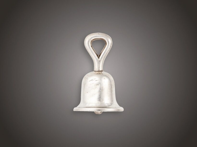 Ezüst 91 g. Öntött harangforma, tetején fogóval. Oldalán sérülés nyomaival.