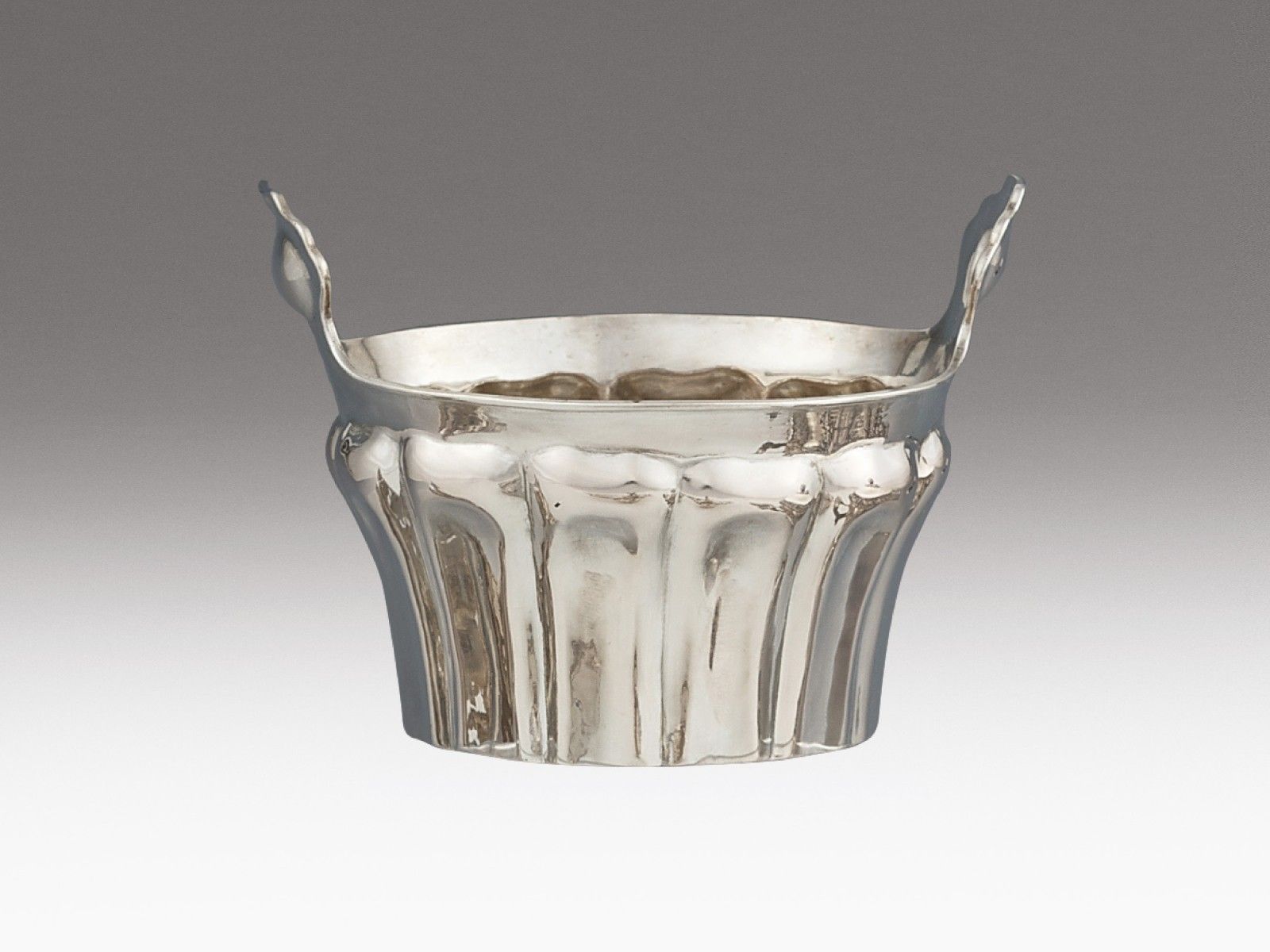 Ezüst, 153 g. Lábakon álló öblös tál, kétoldal, rokályos fülekkel. Peremén domborított és poncolt, virágos-leveles díszítményekkel. Restaurált. Feltehetően német, XIX. század közepe, MK mesterjeggyel. M.: 36 × 18,5 × 9,5 cm