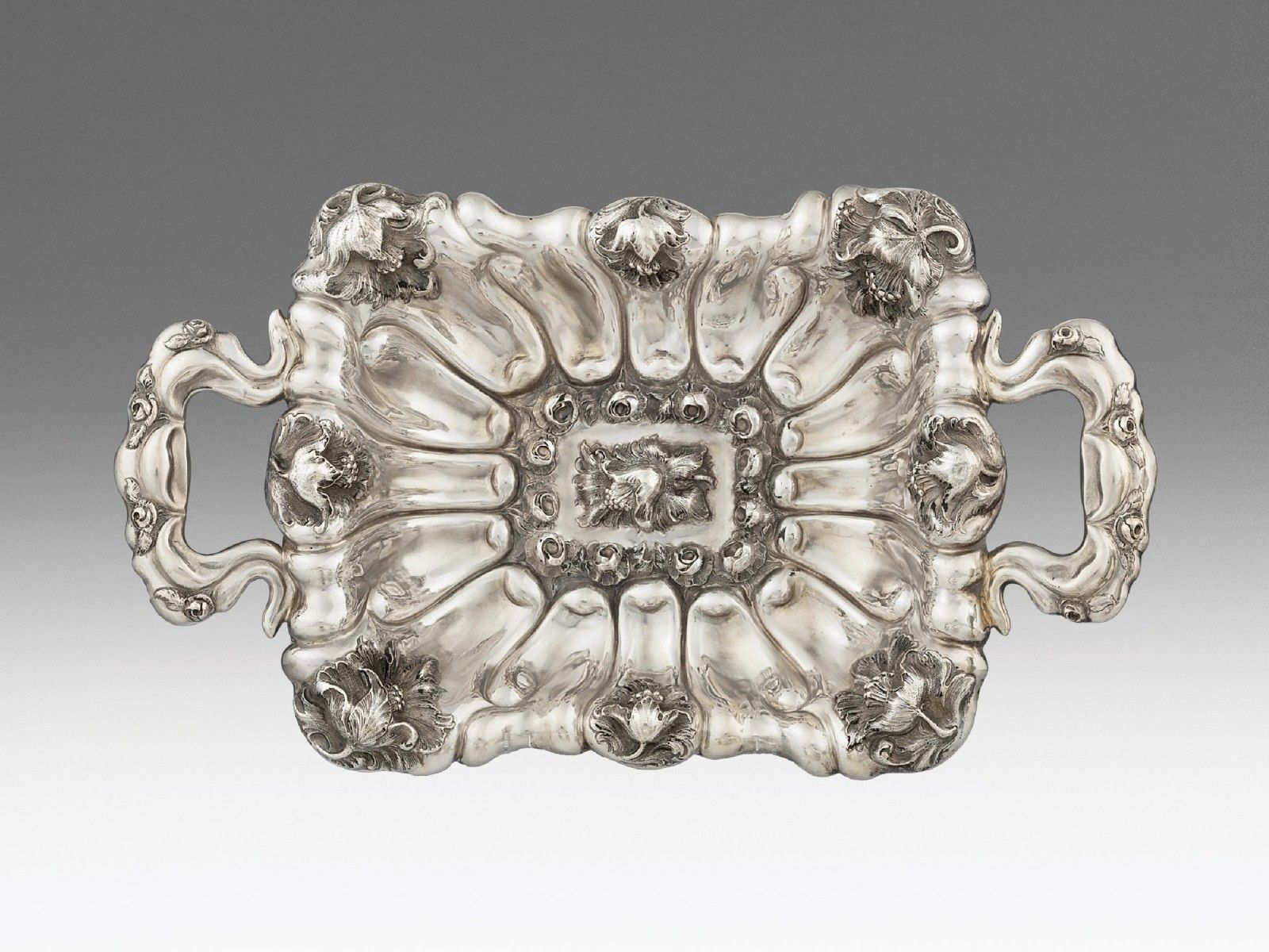 Ezüst, 567 g. Rózsás lábakon álló téglalapforma, kétoldalt bécsirózsákkal díszített fülek. Bordákkal tagolt öblében és peremén domborított, poncolt és vésett virágdíszek, ill. bécsirózsák.